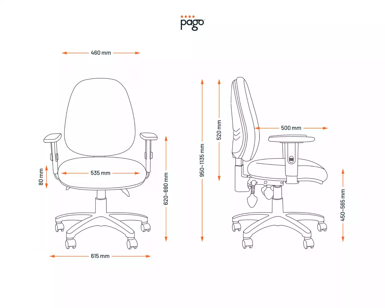 Seat Height - Min 450mm, Max 565mm